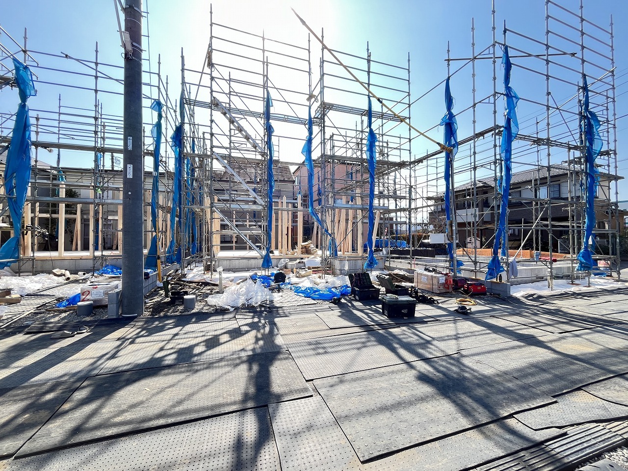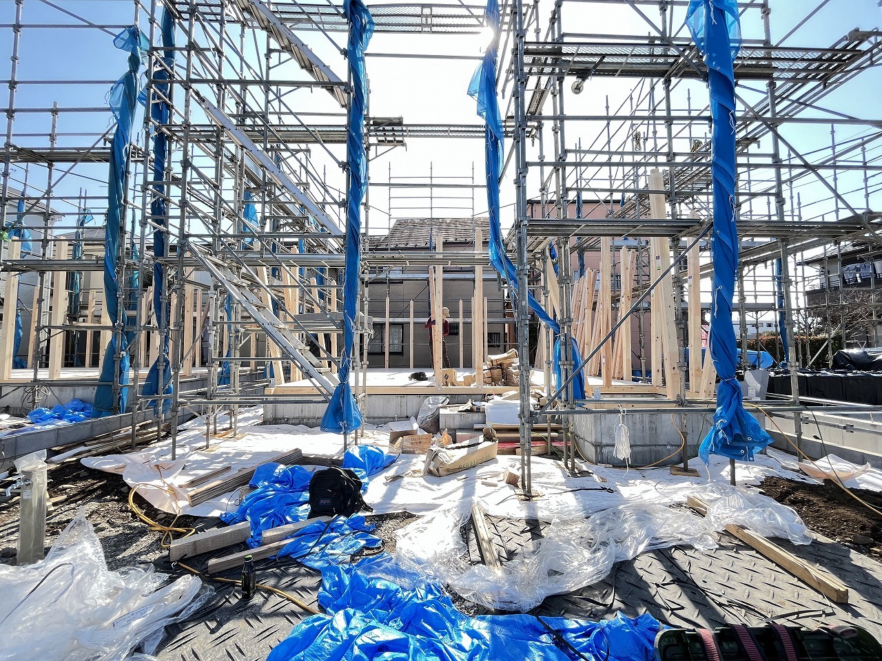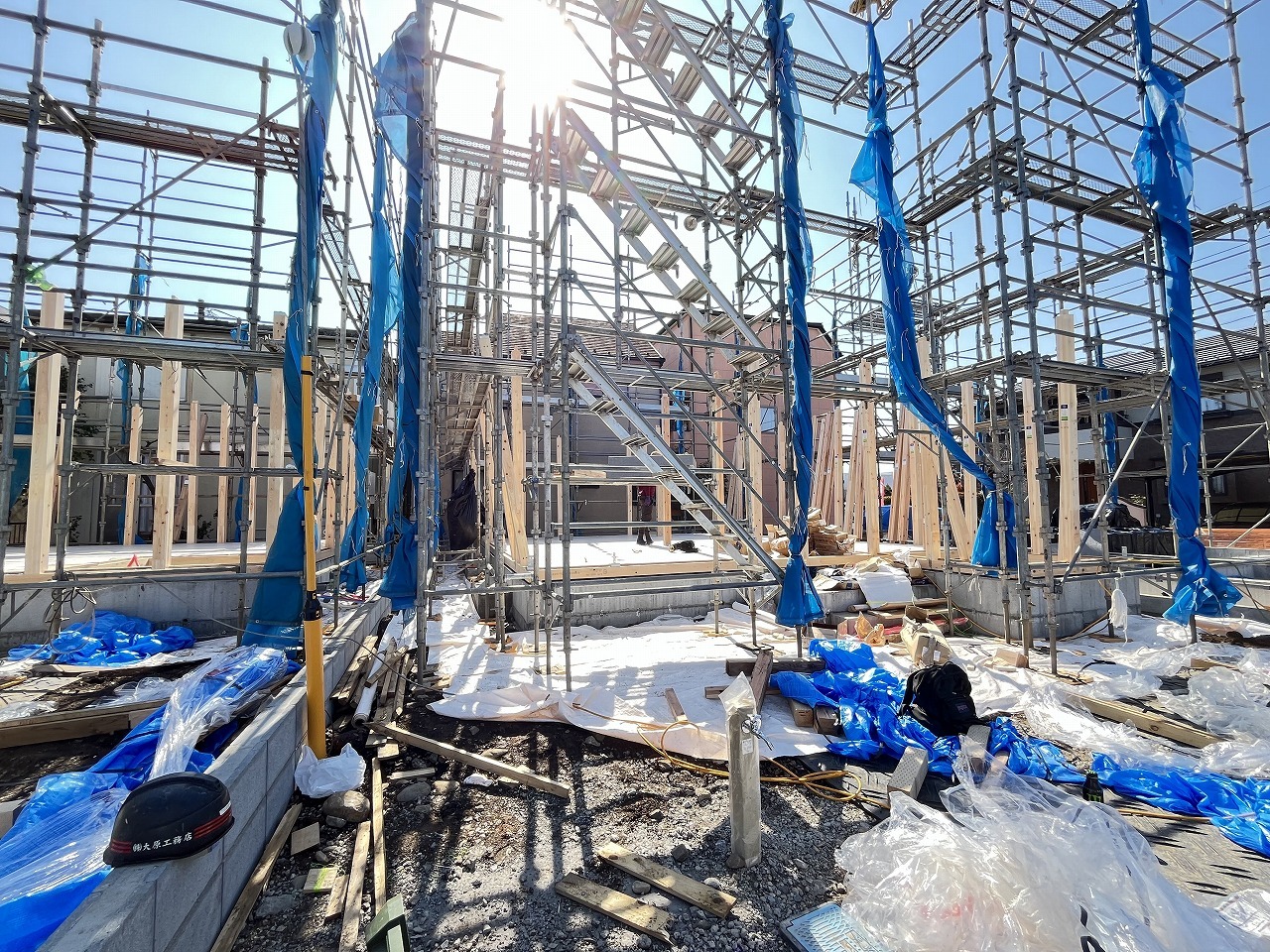 2号棟 青いシートに覆われた未来の住まい、その骨格が形作られ、これから始まる新しい暮らしの予感が、澄み渡る青空の下に広がっています 2026/04/03m
