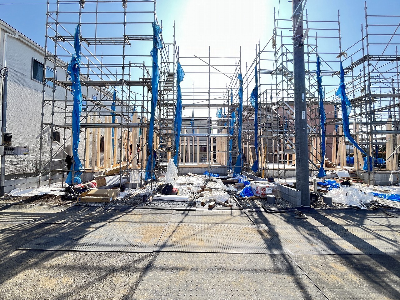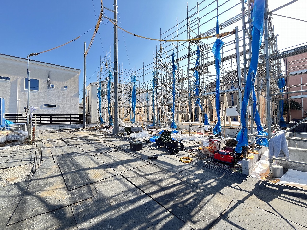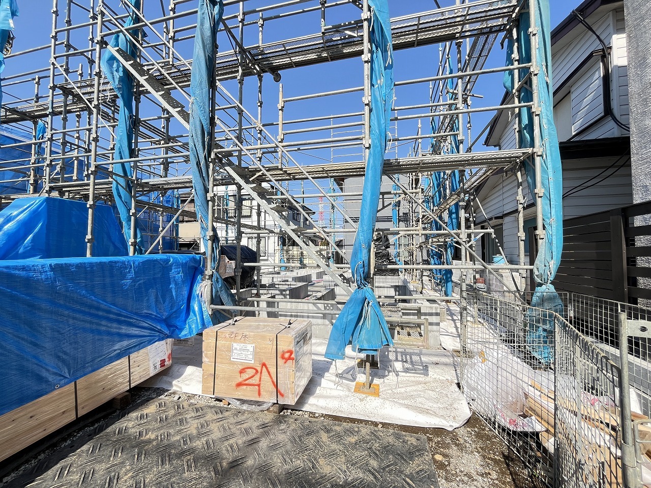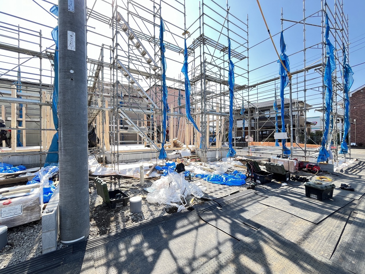 2号棟 青いシートに覆われた未来の住まい、その骨格が形作られ、これから始まる新しい暮らしの予感が、澄み渡る青空の下に広がっています 2026/04/03m
