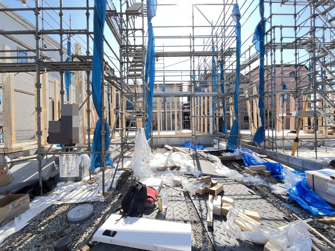 2号棟 清々しい青空の下、職人の手によって、未来への住まいが確かな輪郭を帯びていく。整然と組み上げられた足場は、この地で紡がれる新たな物語の幕開けを静かに物語っているようです