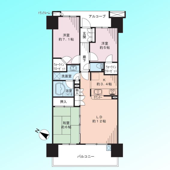 | 間取 | 3LDK (LDK15.4帖、洋室7.1帖、洋室5帖、和室6帖) | ||