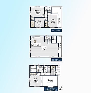 | 間取 | 3SLDK (洋室6.13帖、LDK20.7帖、洋室5.11帖、洋室6.38帖、S6.13帖) | ||