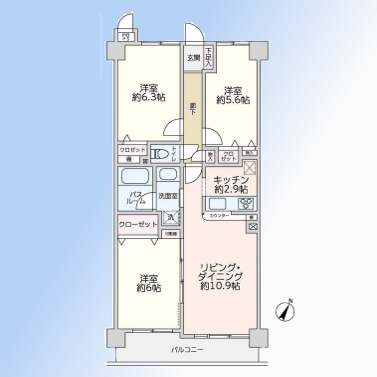 | 間取 | 3LDK (LDK13.8帖、洋室6帖、洋室6.3帖、洋室5.6帖) | ||