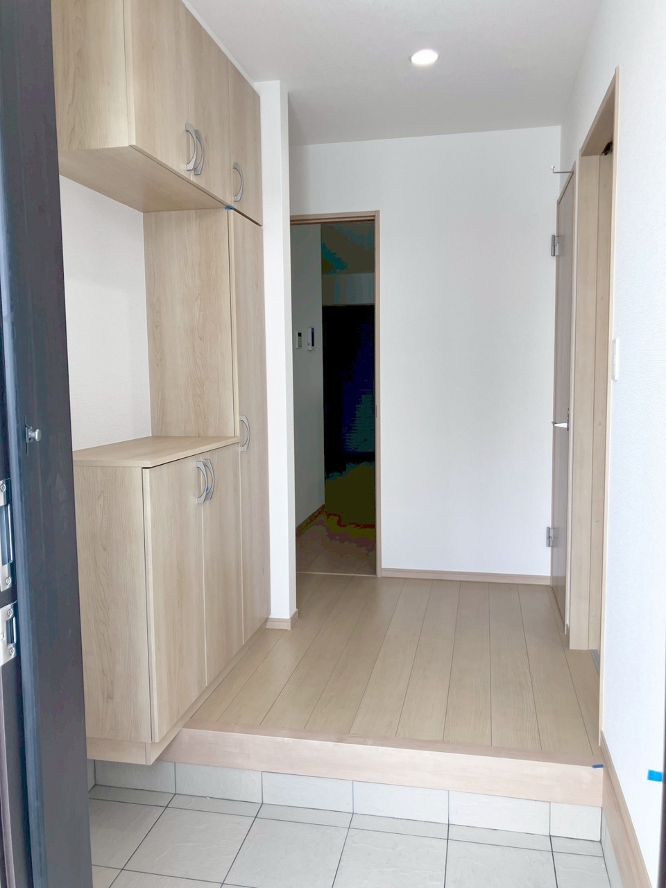 コンパクトながらも、使い勝手の良い玄関スペース。明るいデザインと、収納スペースを効果的に配置することで、使い勝手を最大限に引き出しています。