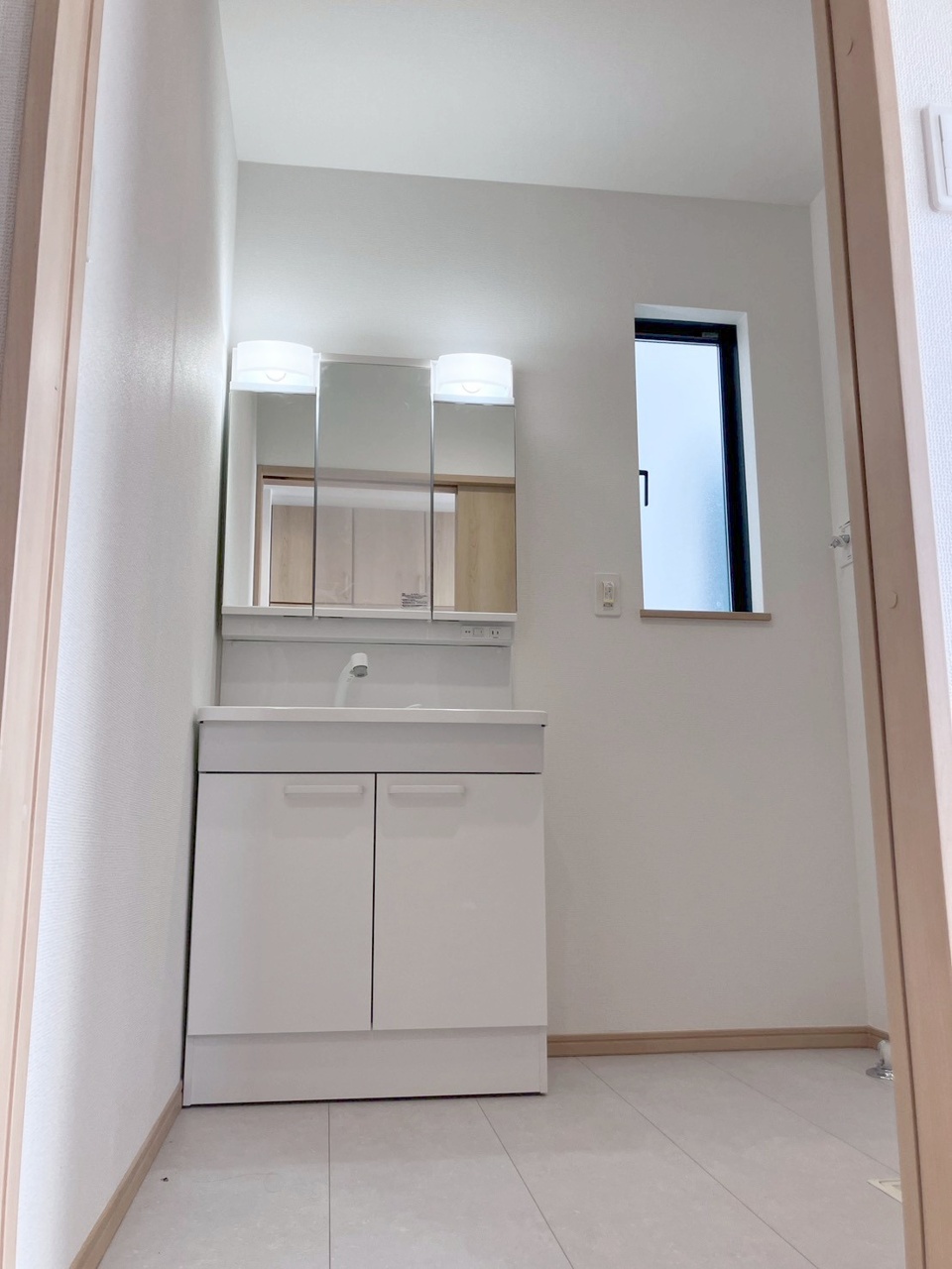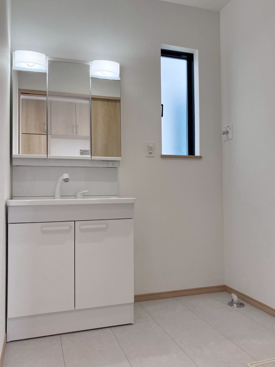 三面鏡に洗面台。 コンセントに照明機能、多機能性を備えた設備です。
