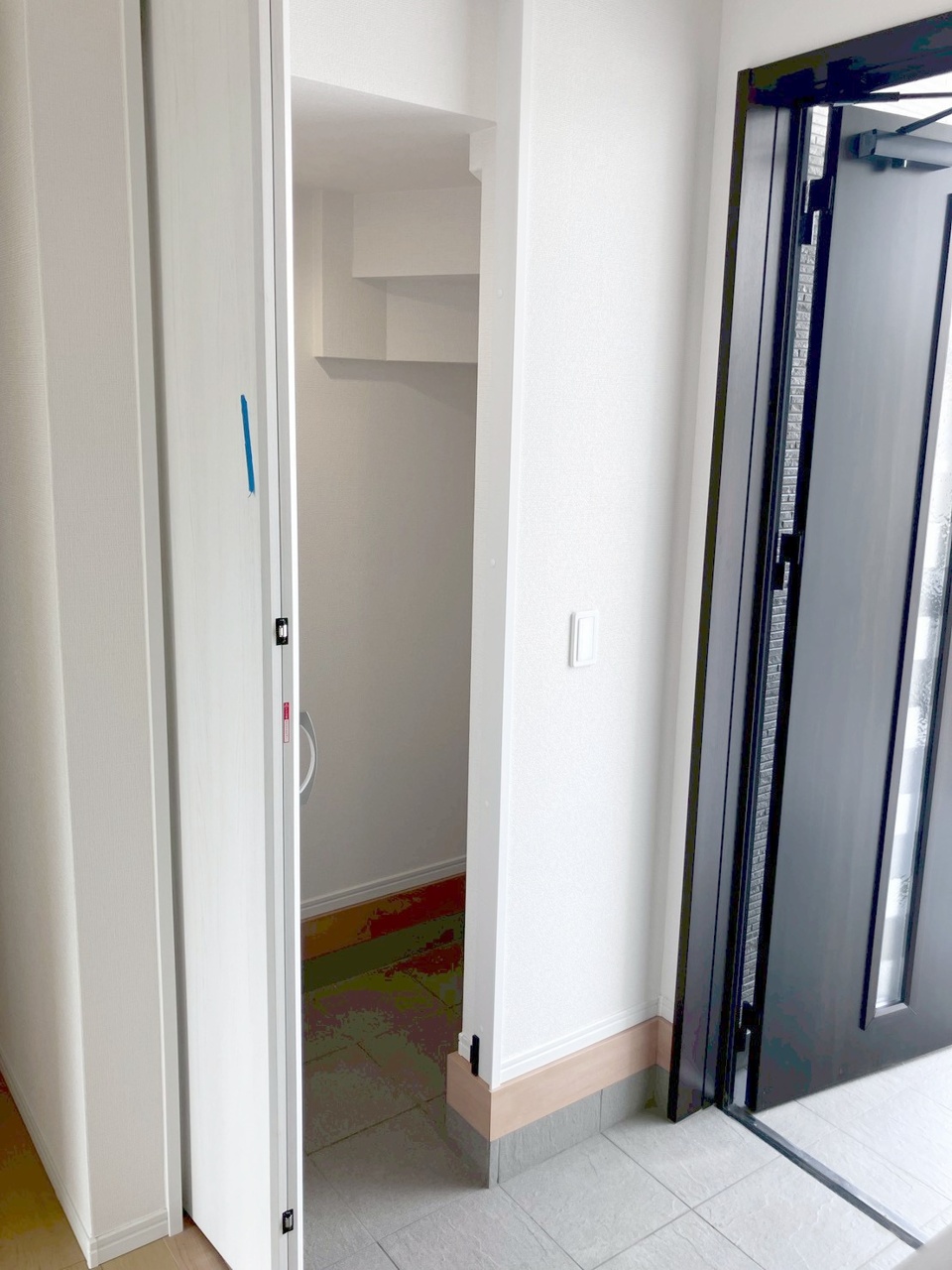 玄関は家の第一印象を左右する重要な場所。ほどよい広さとスタイリッシュな色遣いが印象的です。