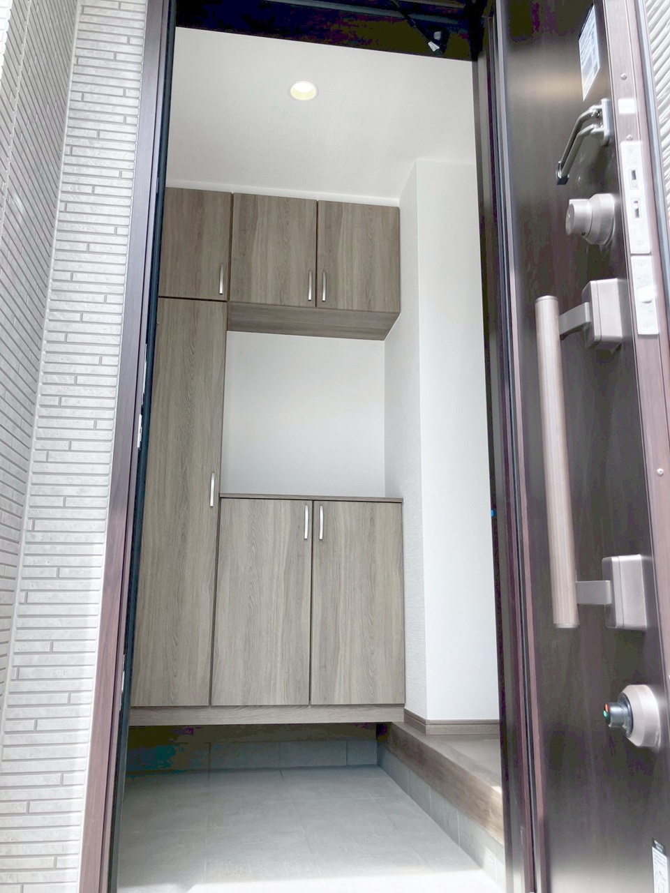 コンパクトながらも、使い勝手の良い玄関スペース。明るいデザインと、収納スペースを効果的に配置することで、使い勝手を最大限に引き出しています。