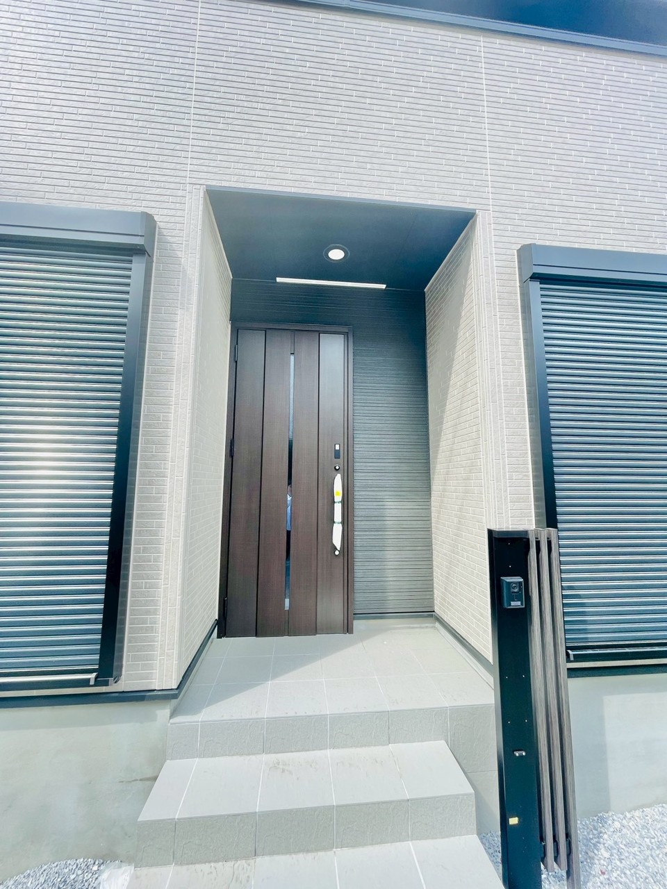 ポーチのついた新築分譲物件。玄関の印象はいかがでしょうか?入口からご覧ください。