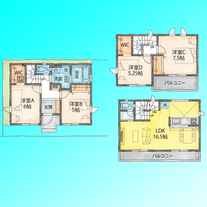 | 間取 | 4LDK (LDK16.5帖、洋室7.5帖、洋室6帖、洋室5.25帖、洋室5帖) | ||