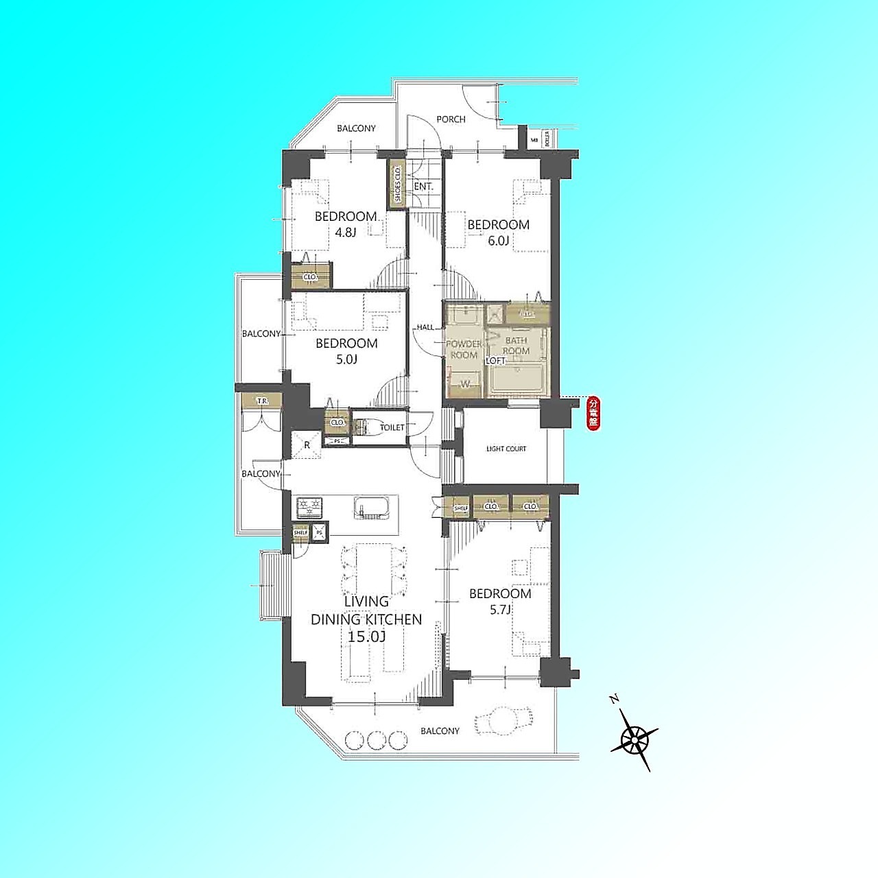 | 間取 | 4LDK (LDK15帖、洋室4.8帖、洋室5帖、洋室5.7帖、洋室6帖) | ||