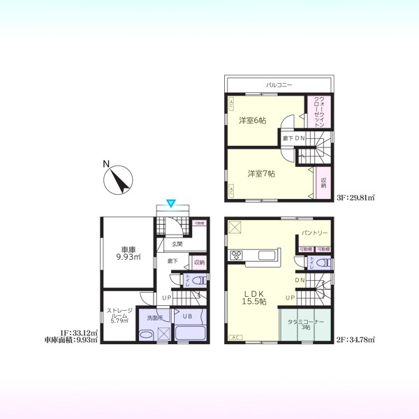 | 備考・制限等 | 2階:タタミコーナー3帖有 建物面積:車庫面積9.93平米を含む 宅地造成及び特定盛土等規制法 | ||