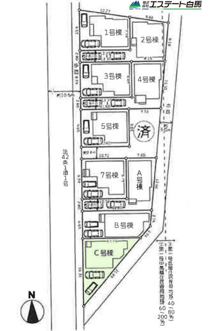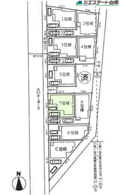 | 備考・制限等 | 準防火地域、高度地区、宅地造成及び特定盛土等規制法、重要土地等調査法、不整形地(2.4.6.A.C号棟)、東側水路(2.4.6.A.B.C号棟)、法22条区域、高さ制限10m、 | ||