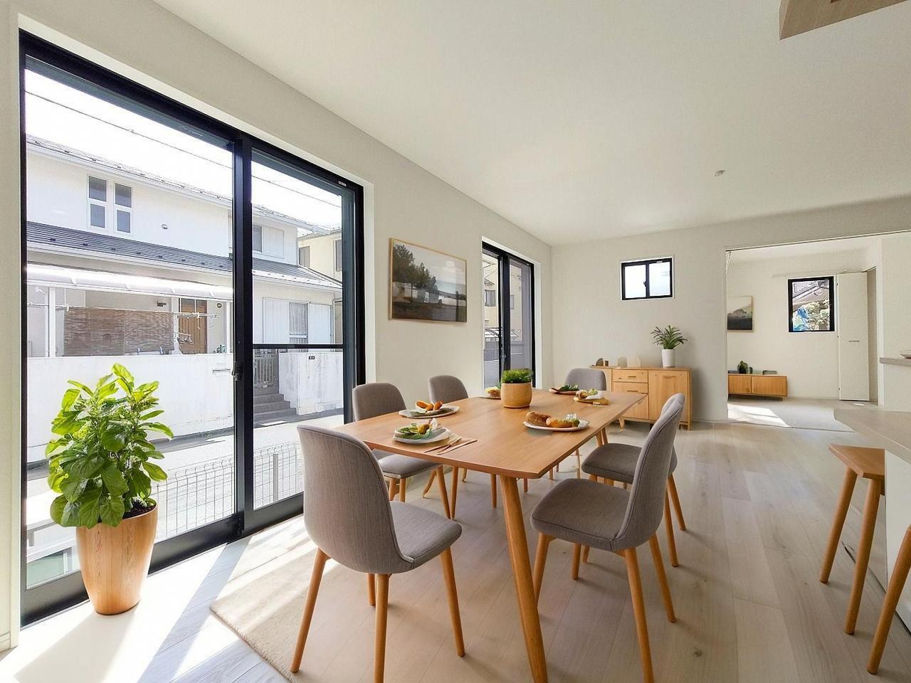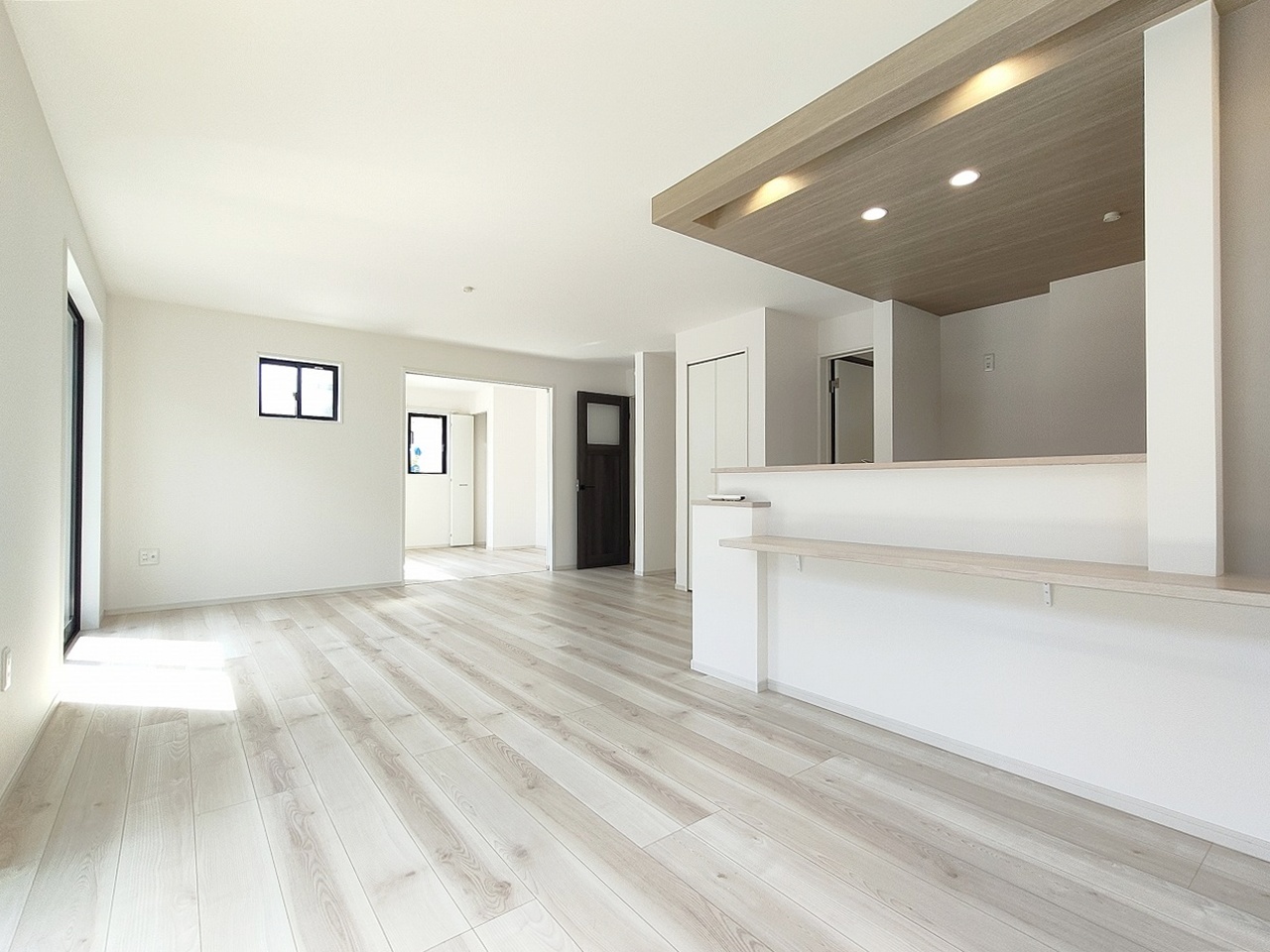 キッチンからLDが一望できる、広くて明るい家族の大好きな空間。 ※CGで家具を配置しております。家具配置のイメージにご覧ください。