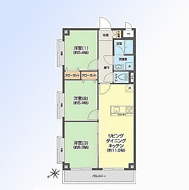 | 間取 | 3LDK (LDK11帖、洋室5.4帖、洋室5.4帖、洋室6.3帖) | ||