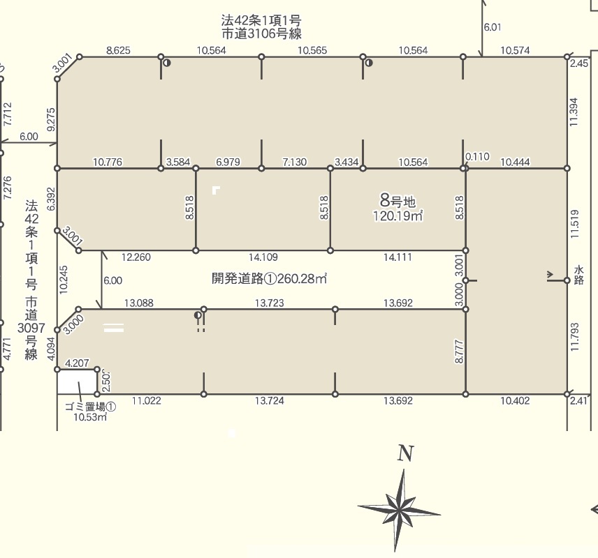 | 土地面積 | 120.19m² 公簿 (私道260.28m²別に有、私道持分比率:1/8、ゴミ置場10.53平米 持分13分の1) | ||