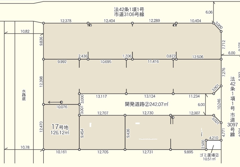 | 土地面積 | 126.12m² 公簿 (私道242.07m²別に有、私道持分比率:1/8、ゴミ置場10.51平米 持分12分の1) | ||