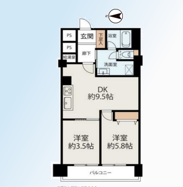 | 間取 | 2DK (DK9.5帖、洋室3.5帖、洋室5.8帖) | ||