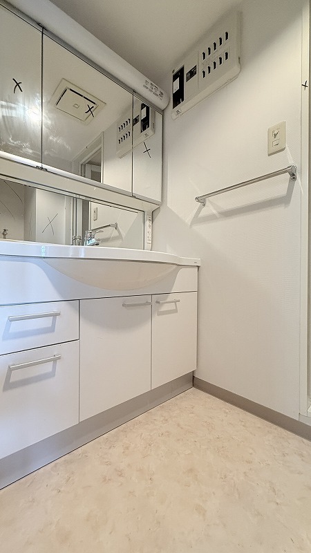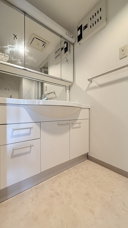 三面鏡に洗面台。 コンセントに照明機能、多機能性を備えた設備です。