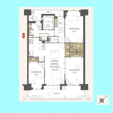 | 間取 | 3LDK (LDK14.2帖、洋室6.1帖、洋室6帖、洋室4.5帖) | ||