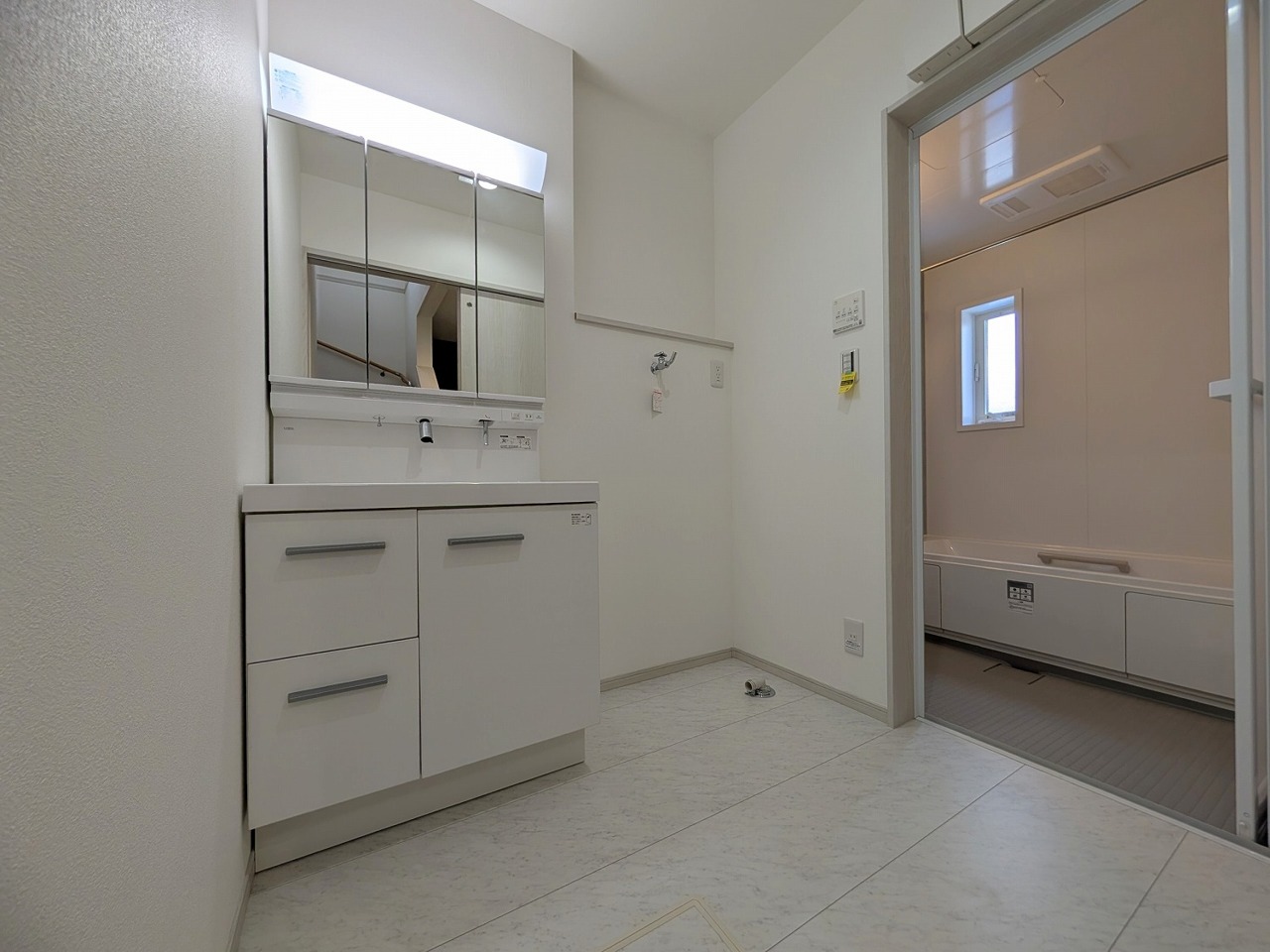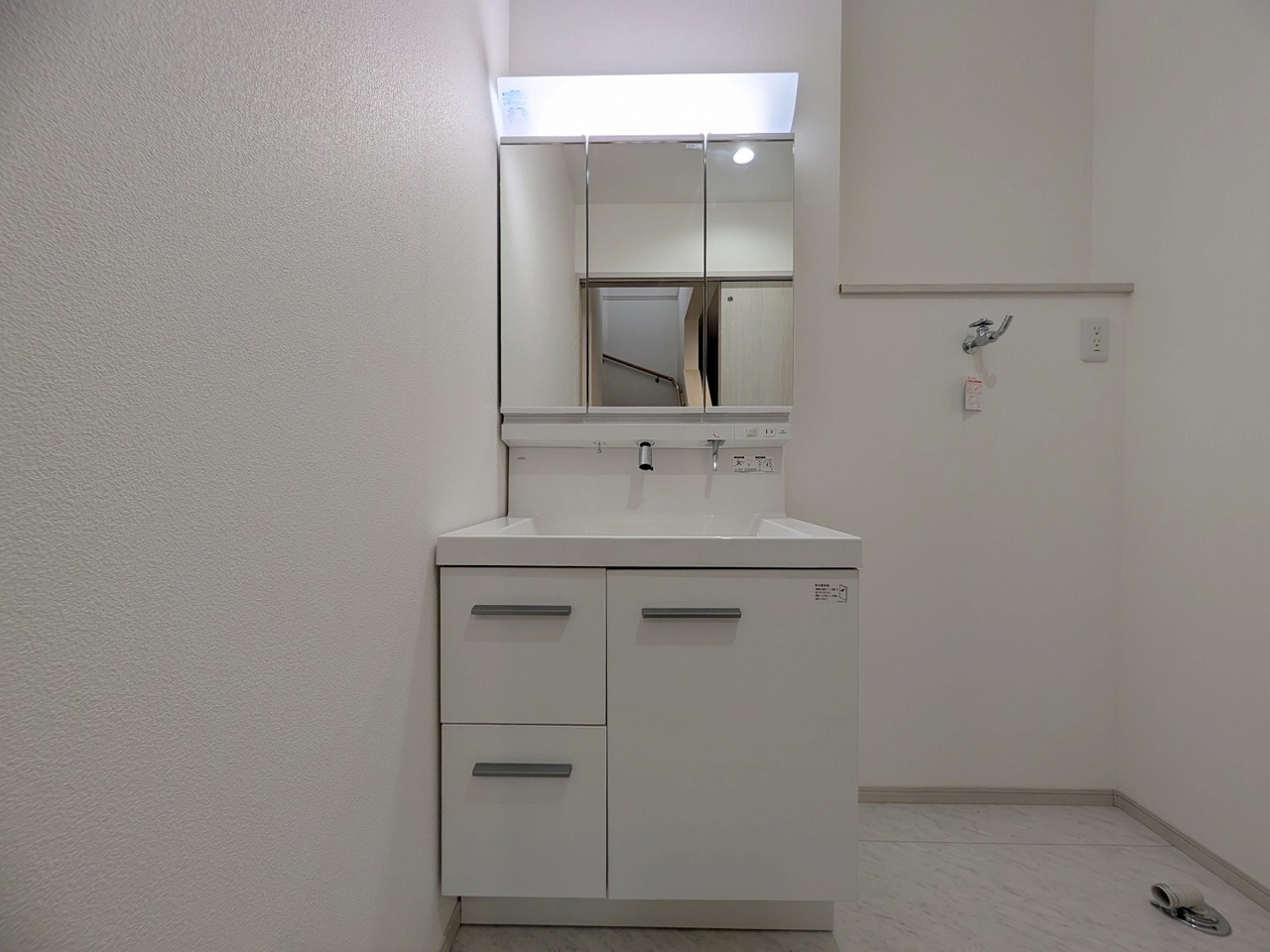 三面鏡を採用した洗面化粧台。鏡の裏にも収納スペースがあります。