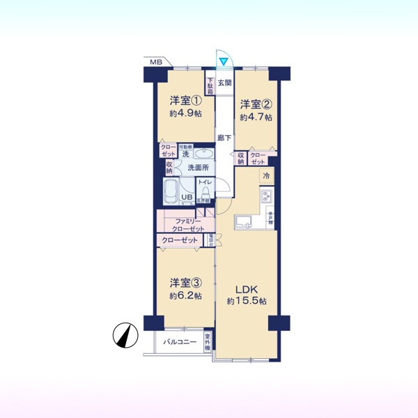 | 間取 | 3LDK (LDK15.5帖、洋室6.2帖、洋室4.9帖、洋室4.7帖) | ||