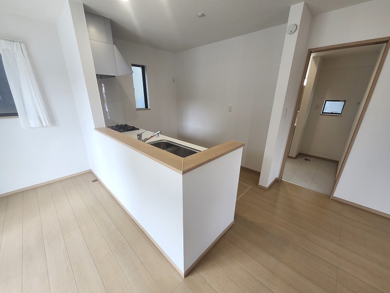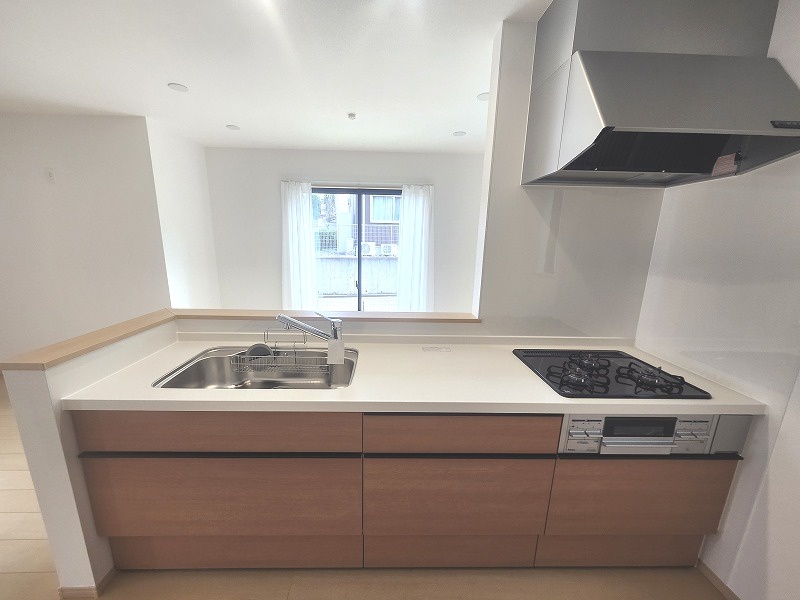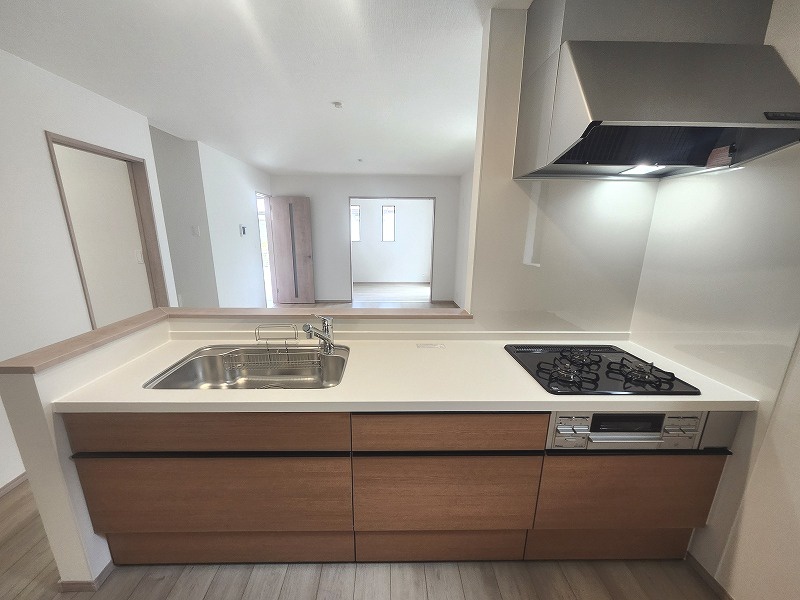 E号棟 お料理をしながらリビングの家族やゲストとの会話が楽しめるカウンタータイプのキッチン。毎日のお料理を楽しく快適に。