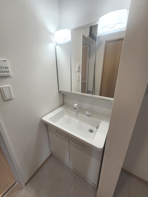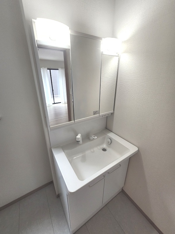 F号棟 三面鏡に洗面台。 コンセントに照明機能、多機能性を備えた設備です。