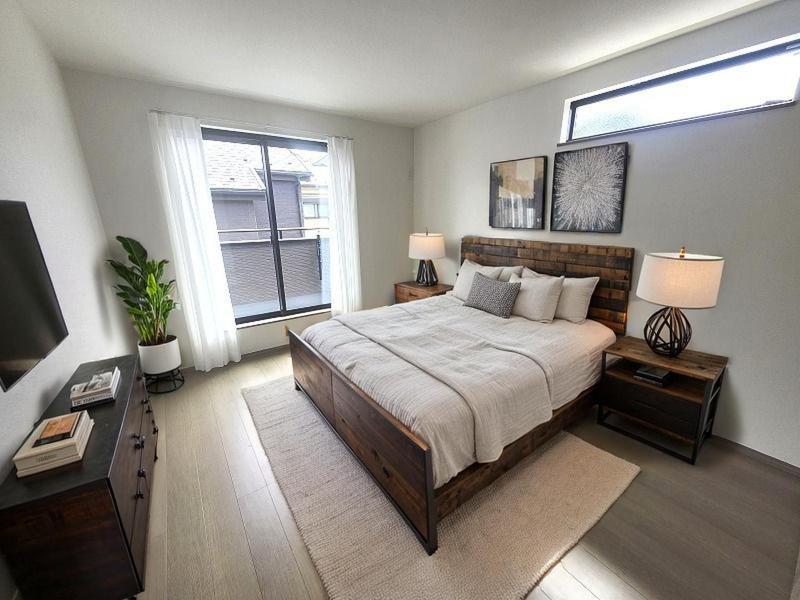 D号棟 洋室はモダンなデザインと機能性を備え、快適な生活空間に。明るい窓から差し込む自然光が広々とした空間をさらに明るく開放的に感じさせます。