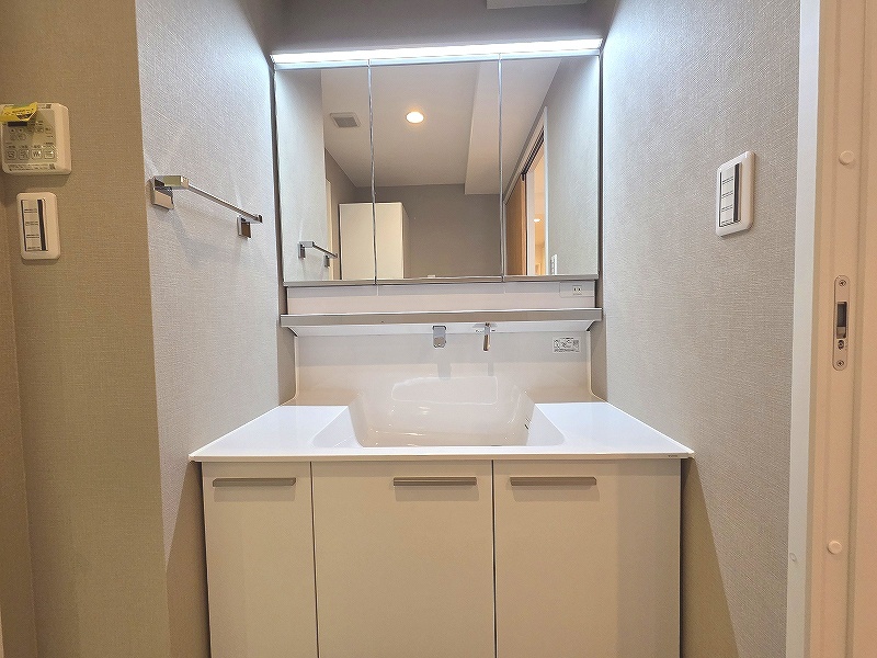 三面鏡に洗面台。 コンセントに照明機能、多機能性を備えた設備です。