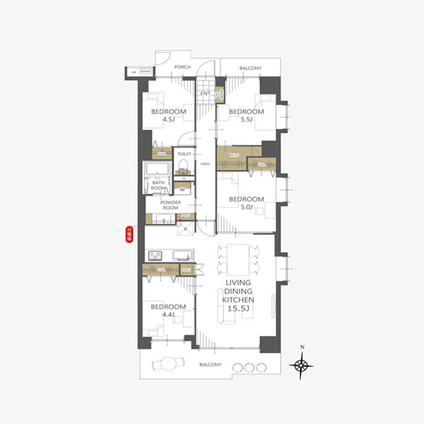 | 間取 | 4LDK (LDK15.5帖、洋室5.5帖、洋室5帖、洋室4.5帖、洋室4.4帖) | ||