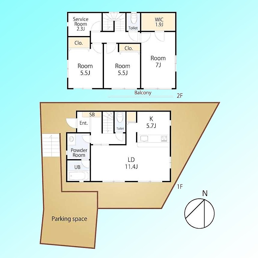 | 間取 | 3SLDK (K5.7帖、LD11.4帖、S2.3帖、洋室5.5帖、洋室5.5帖、洋室7帖) | ||