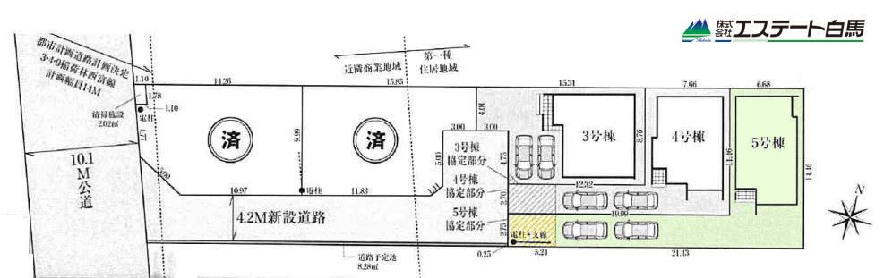 | 備考・制限等 | 法22条区域、ゴミ置場持分2.02平米の内1/5あり、道路予定地8.28平米の内1/5あり、がけ条例、航空法、景観法、西側に都市計画道路あり、不整形地(4.5号棟)、協定部分あり | ||