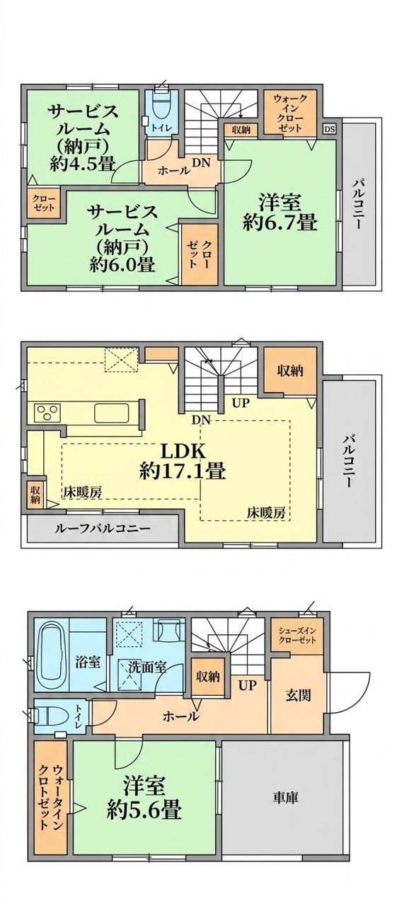 | 間取 | 2SLDK (洋室5.6帖、LDK17.1帖、洋室6.7帖、S4.5帖、S6帖) | ||