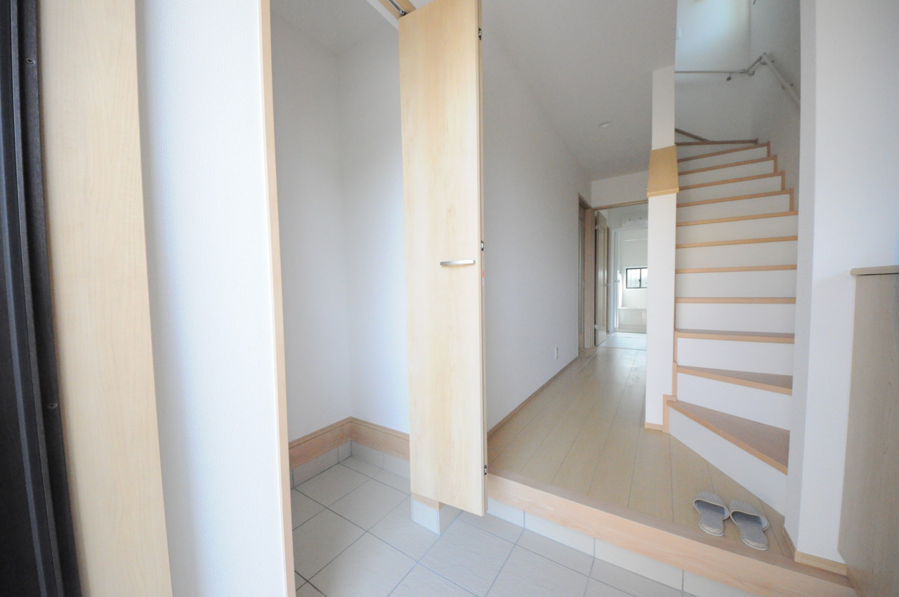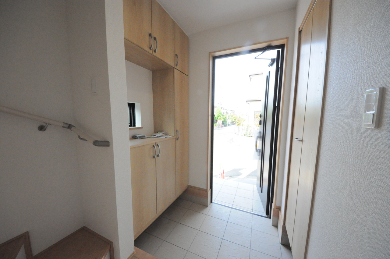 明るく開放的な玄関、靴の脱ぎ履きもしやすく、収納も豊富でご家族皆様の靴をスッキリ収納できます。