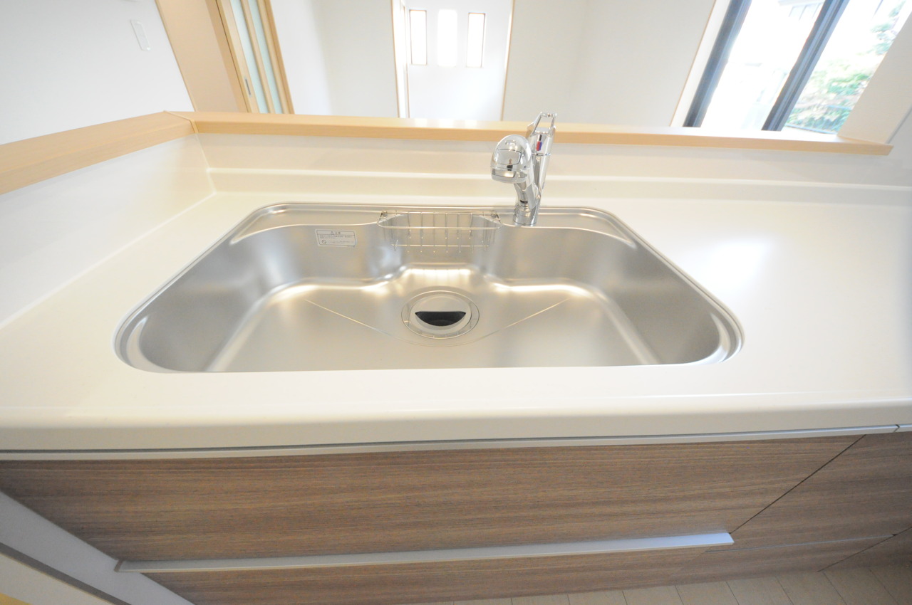 人工大理石を使用したシステムキッチン。永く傷つきにくく、お手入れもしやすい高機能性です。