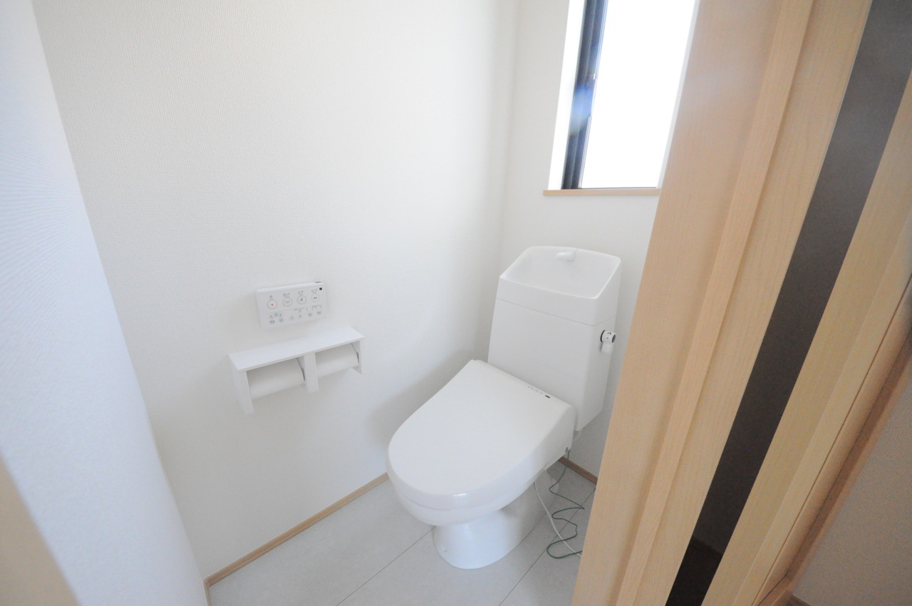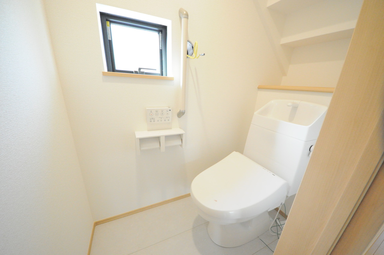 ウォシュレット機能付きのトイレ。換気のしやすい窓付きで、収納もあり実用性も兼ね備えた造り。