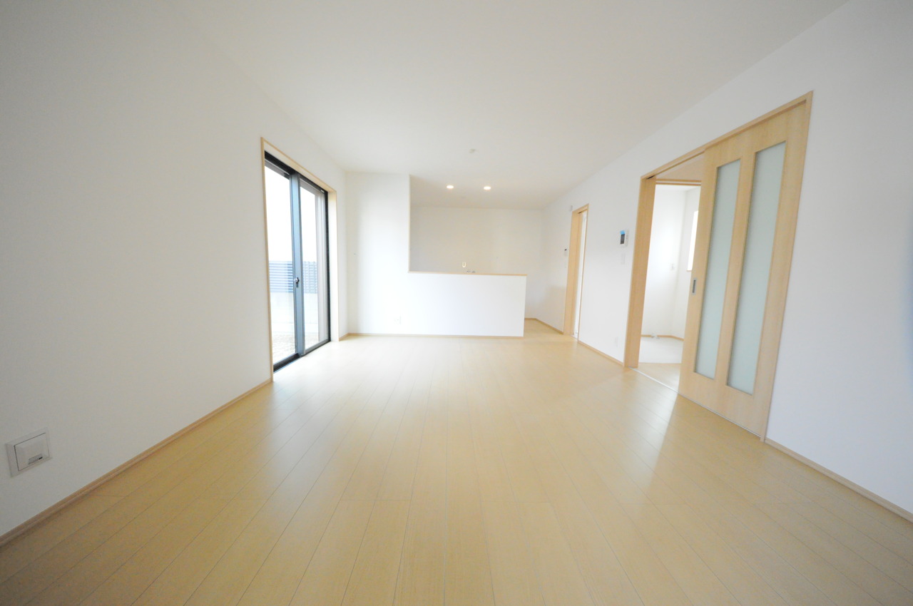 家族や友人、両親、親戚とこれから沢山の時間を紡ぐのだろう。そこを彩るのは窓から見える青い空、心地よい緑。そんなイメージが膨らむリビングスペース。