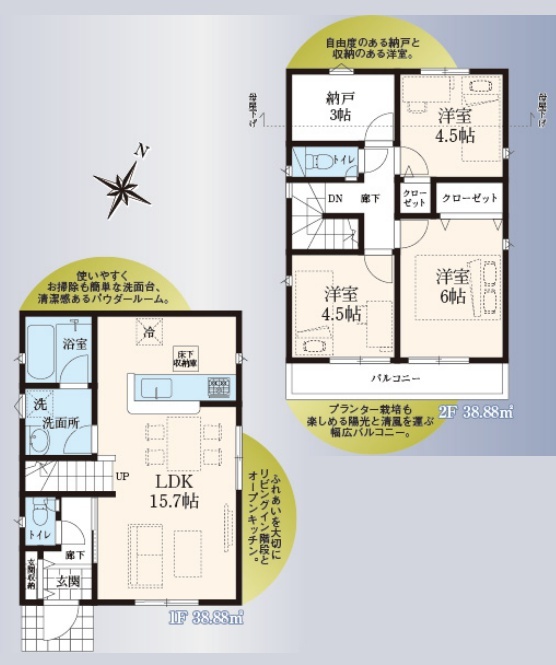 閑静な住宅地LDK15帖以上全室2面採光床下収納全居室収納ワイドバルコニー複層ガラスシステムキッチンカウンターキッチン3口以上コンロトイレ2ヶ所温水洗浄便座シャワー付洗面台浴室乾燥機浴室暖房浴室に窓全居室フローリングリビング階段TVモニタ付インターホン太陽光発電システム防犯カメラ小学校800m以内スーパー400m以内