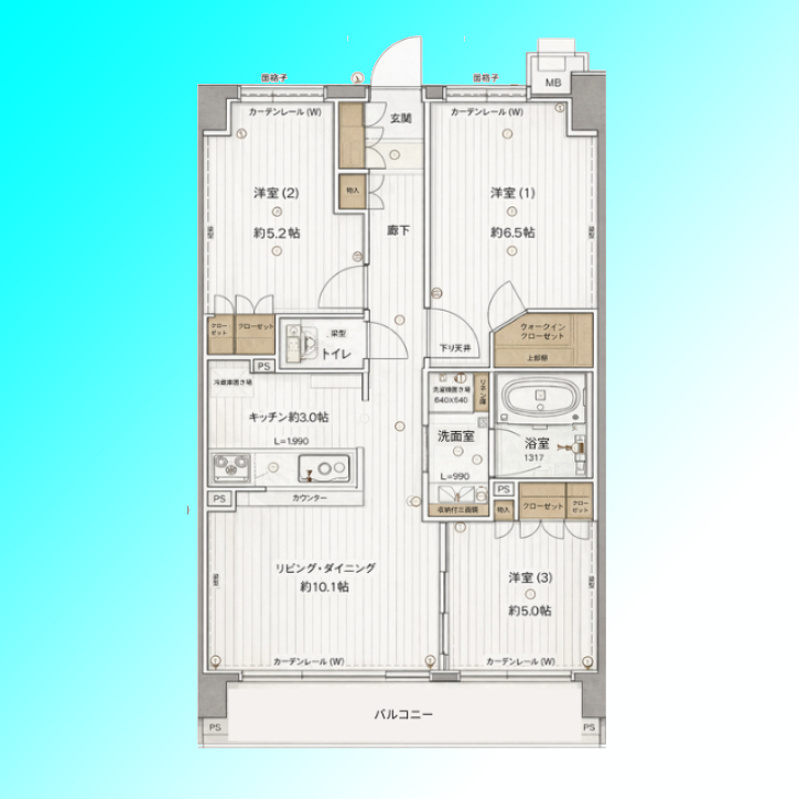 | 間取 | 3LDK (LD10.1帖、K3帖、洋室6.5帖、洋室5.2帖、洋室5帖) | ||