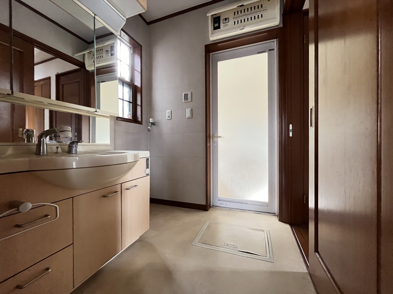 洗面台横にランドリーコーナーもゆったり。ドラム式洗濯機も置けそう。