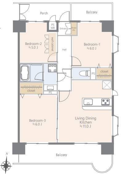 | 間取 | 3LDK (洋室6帖、洋室6帖、洋室5帖、LDK11帖) | ||