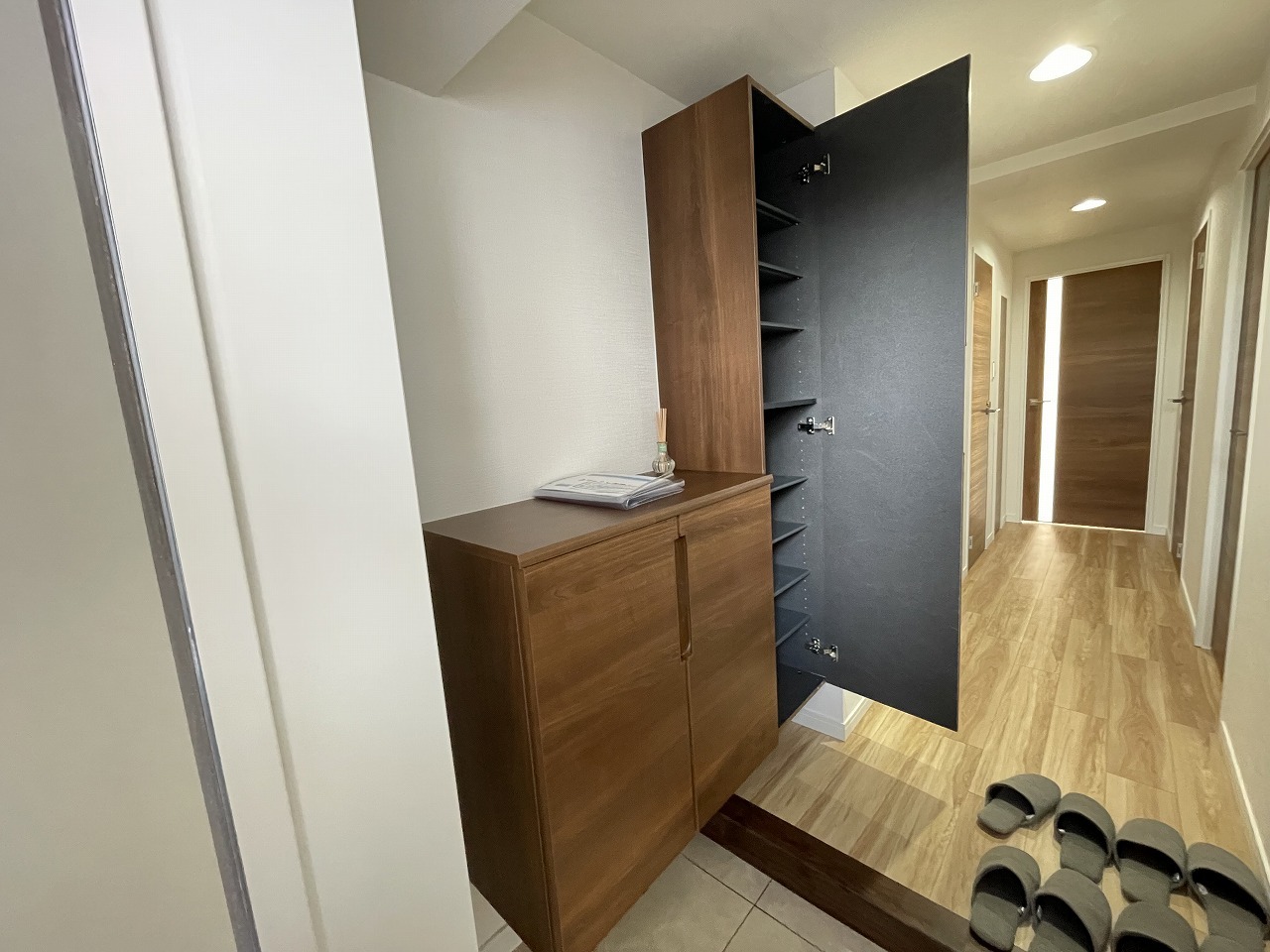 木目のシンプルなデザインが家の雰囲気にマッチした玄関収納。