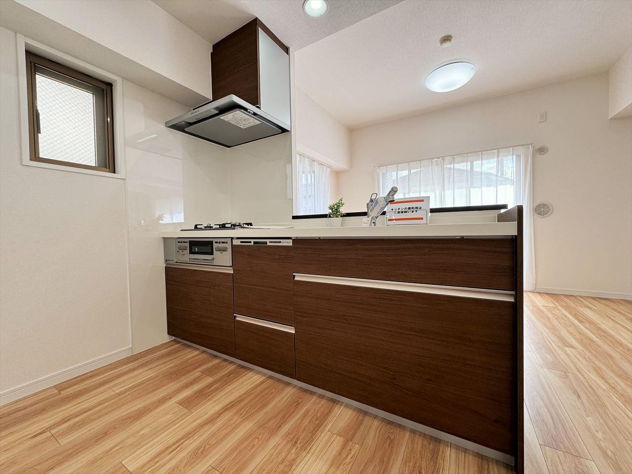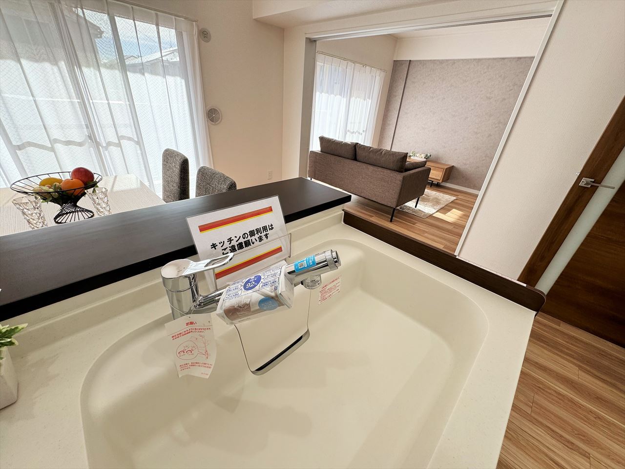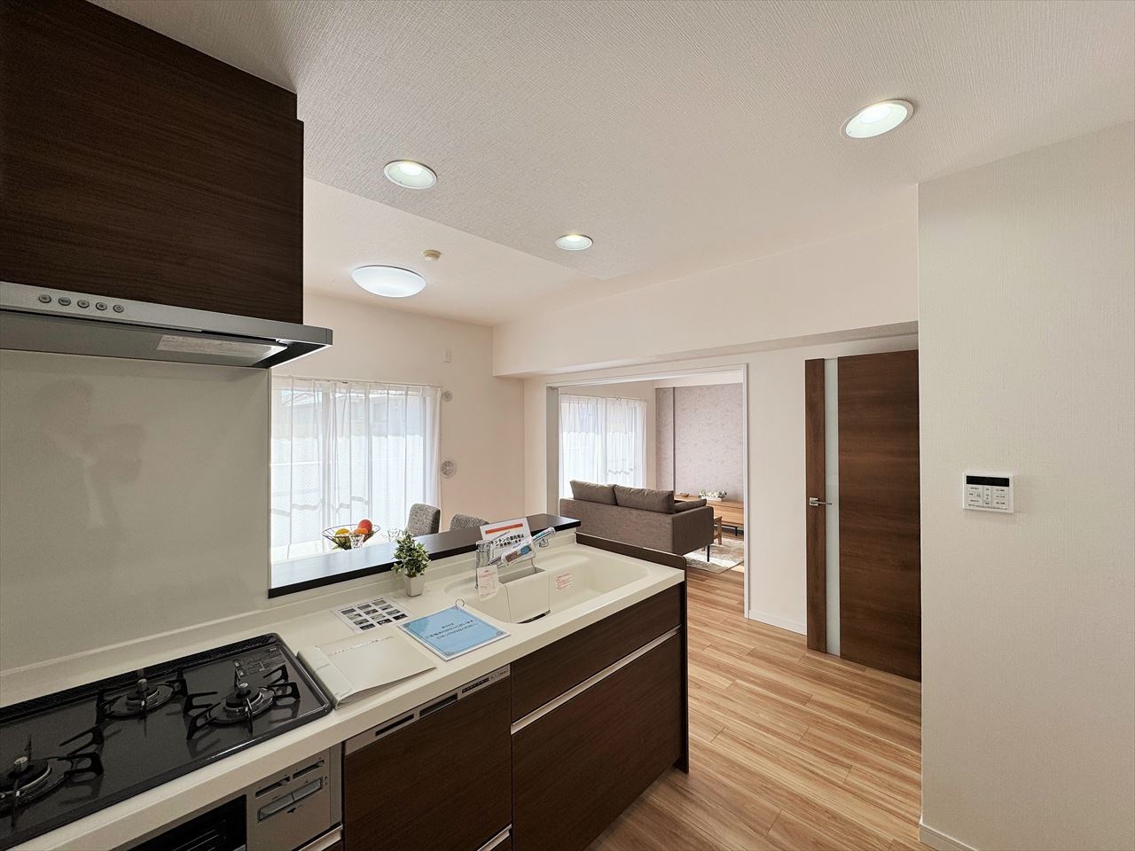 吊戸棚をなくした対面キッチン、隣の部屋にいる方の様子もここからよく見えます。
