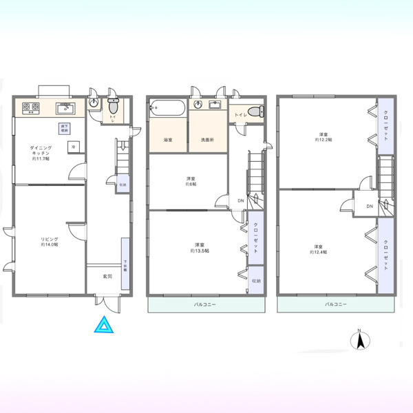 | 間取 | 4LDK (LDK25.7帖、洋室13.5帖、洋室6帖、洋室12.4帖、洋室12.2帖) | ||