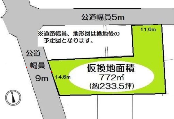 | 備考・制限等 | 換地後西側に9メートル・北側に5メートル接道/北新宿地区地区計画/北新宿第二土地区画整理事業地内/仮換地指定済/農地法第5条の届出要す/契約不適合免責/76条申請により建築可能 | ||