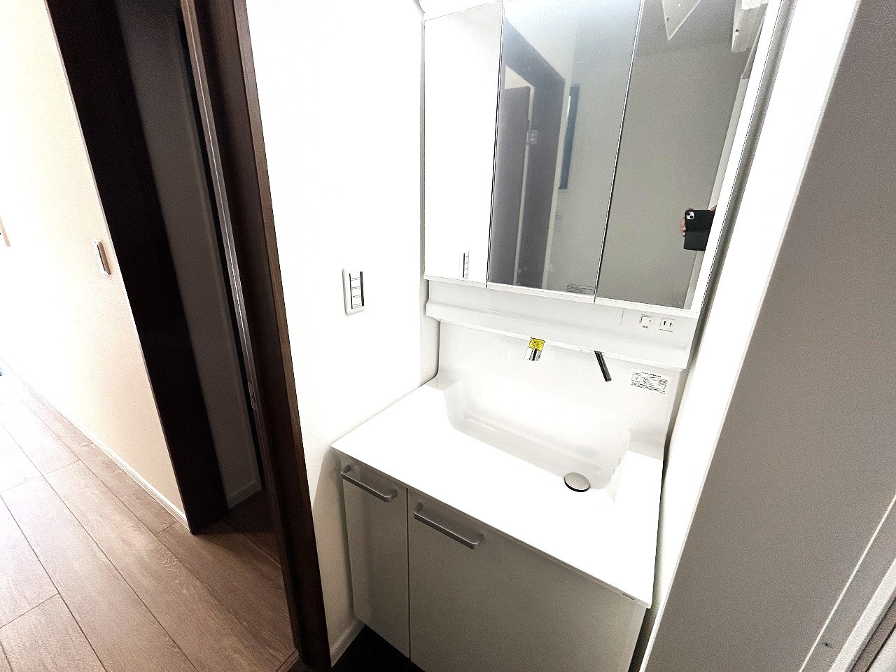お出かけ前の身だしなみに一歩差がつく三面鏡。ミラー裏にはたっぷり収納もございます。