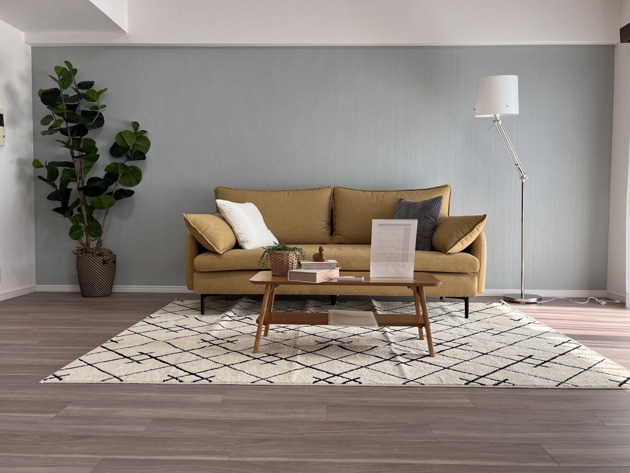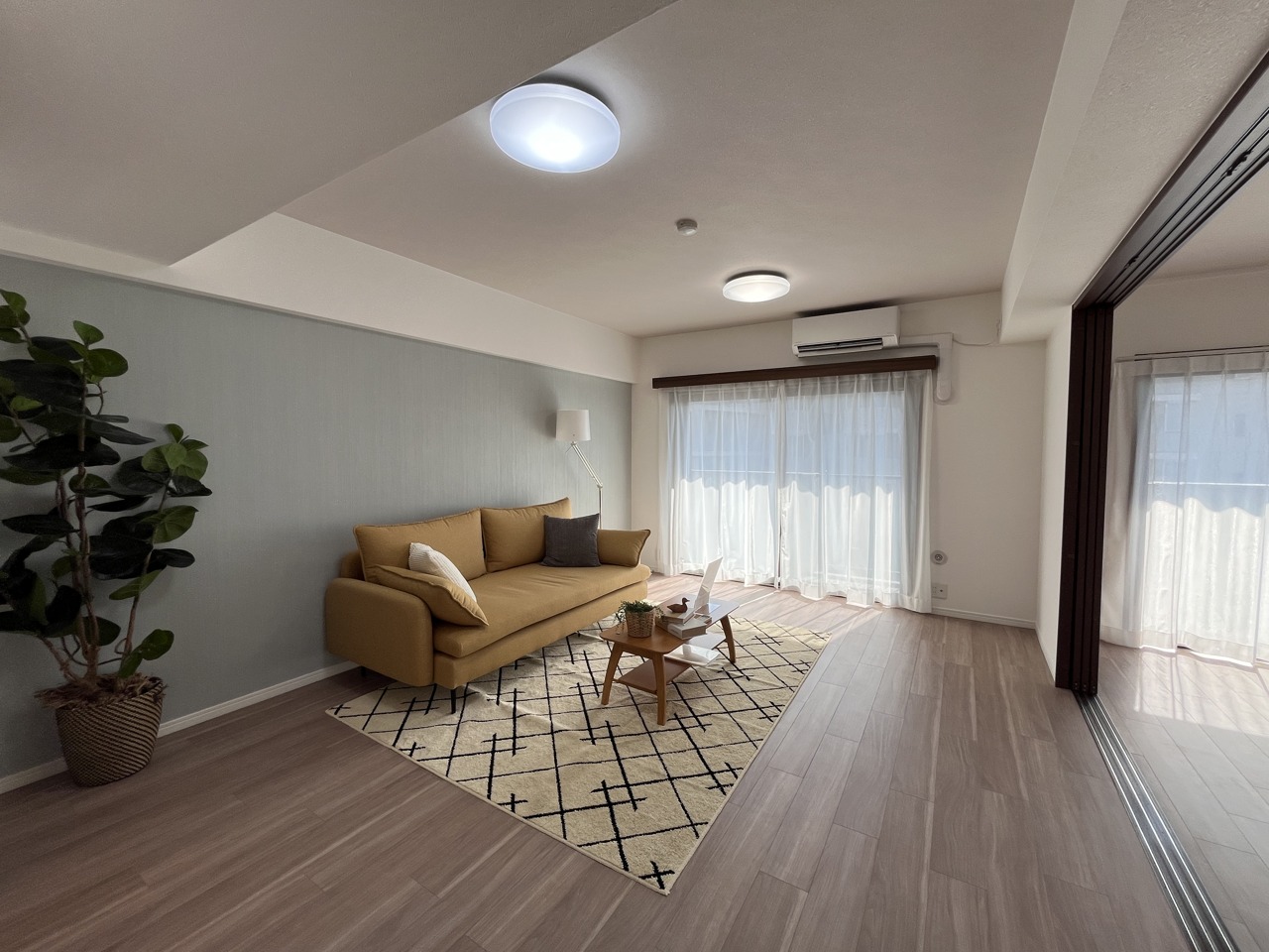 リビングは家具の配置も思いのまま。自由度が高い設計です。写真のソファー・テーブル・ラグマット付です。