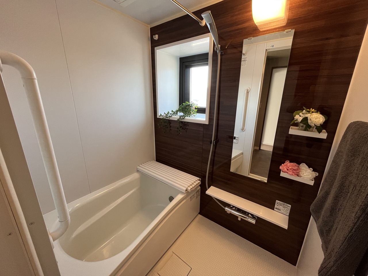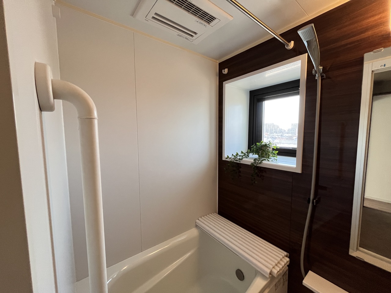 浴室内の窓、外の景色が見られ、採光や換気もできる角部屋ならでのメリットです。