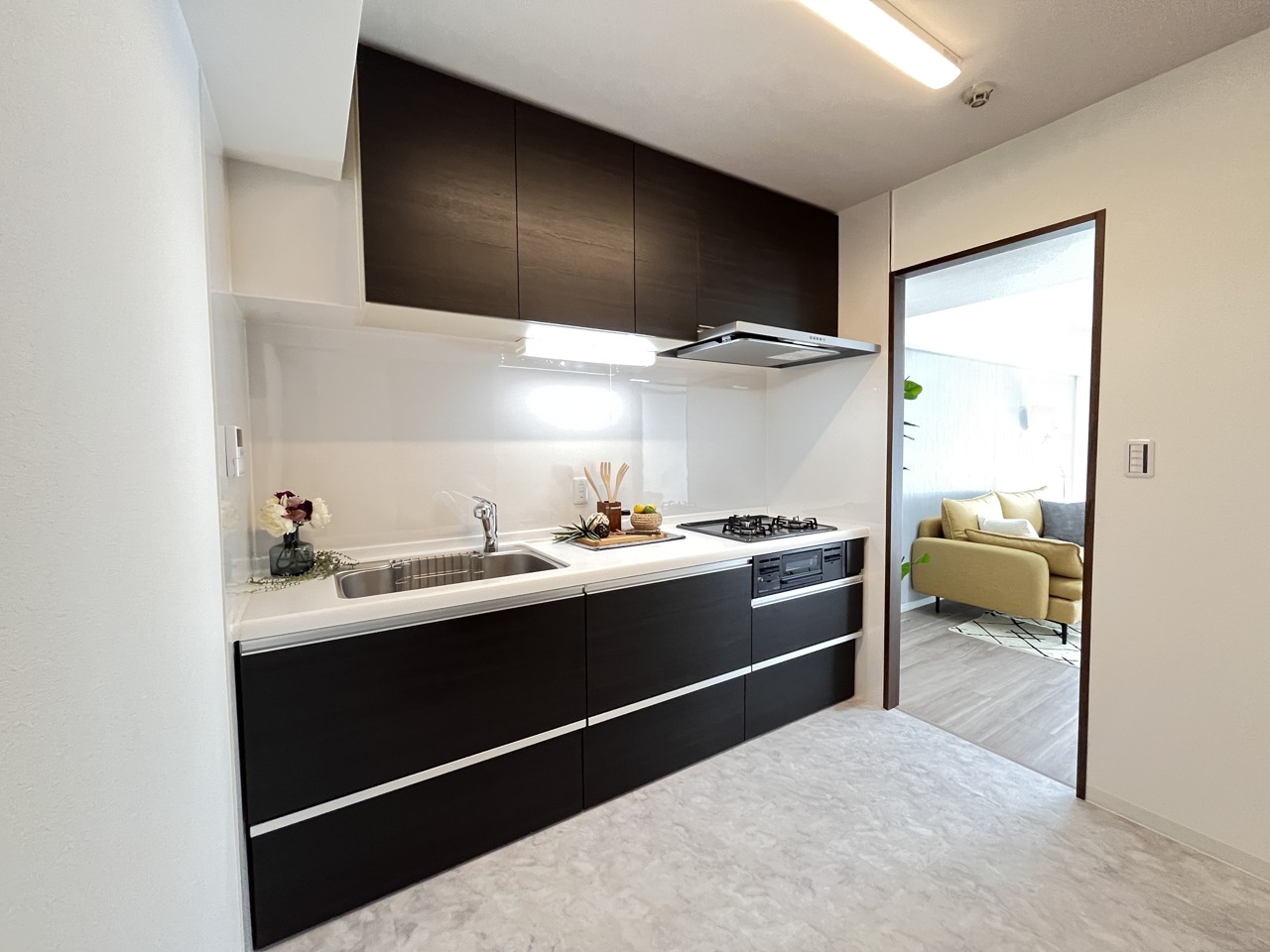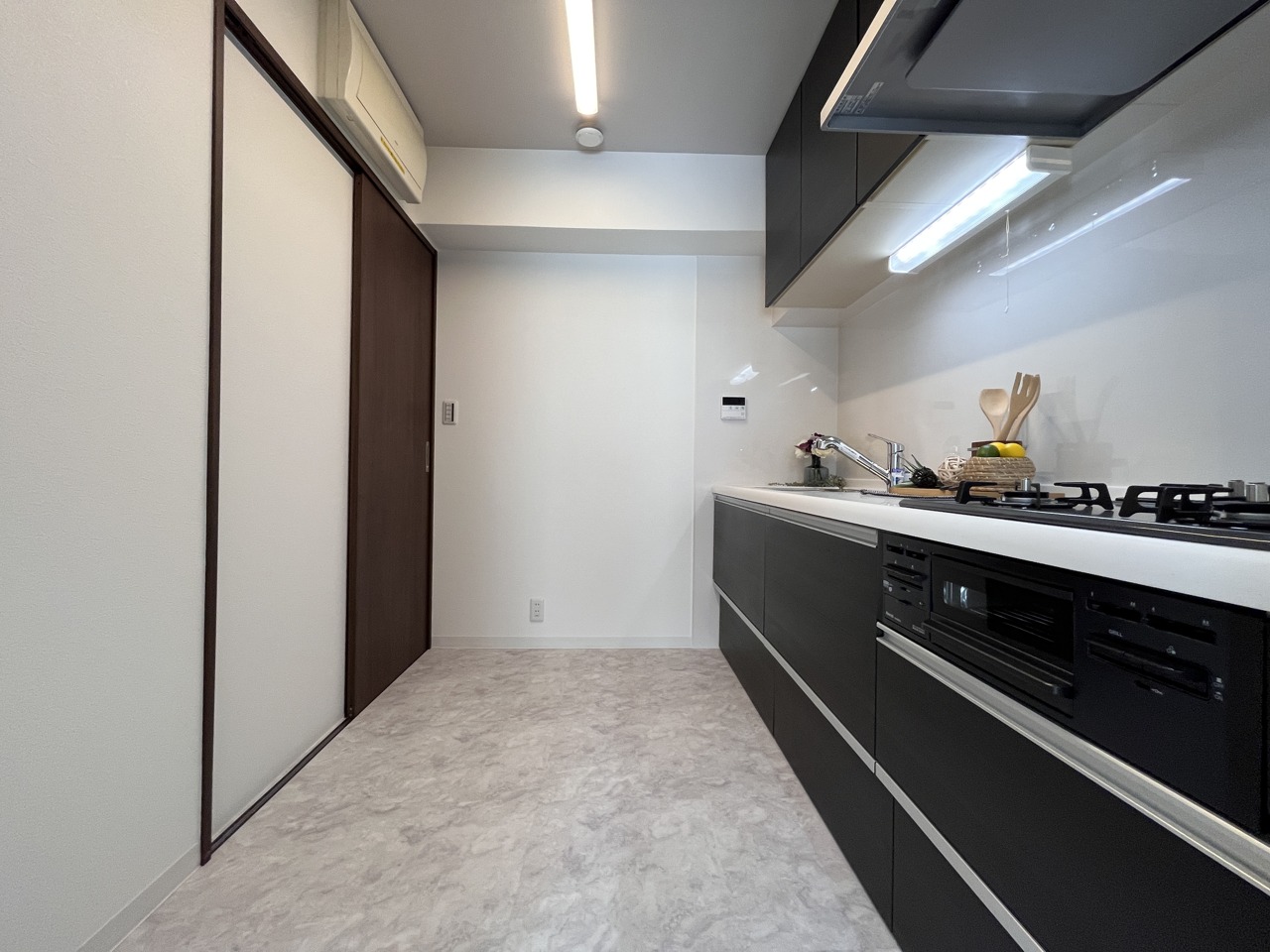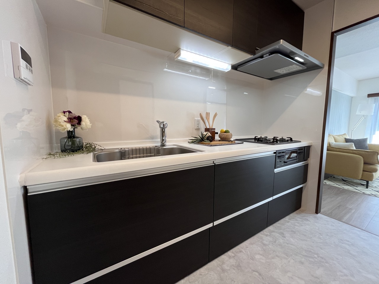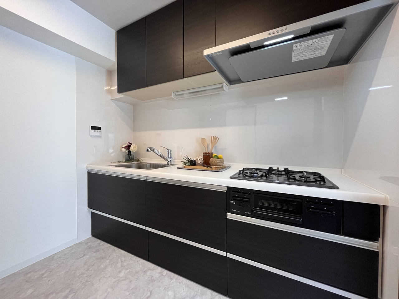壁付のキッチンは上部に収納があり、空間を有効活用したすっきりとしたデザイン。