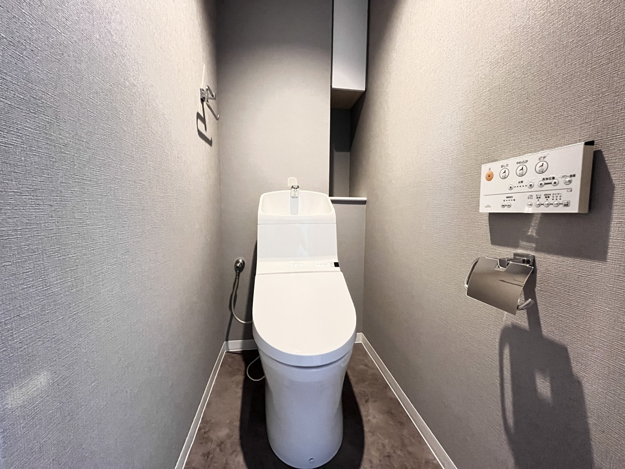 ウォシュレット機能付きのトイレ。収納もあり実用性も兼ね備えた造り。