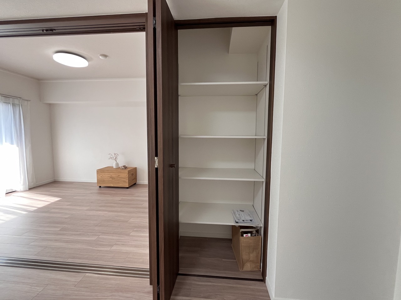 パントリーにも使える収納。稼動棚で高さ調節ができ、非常食や食品のストックも沢山置けます。